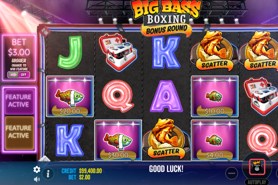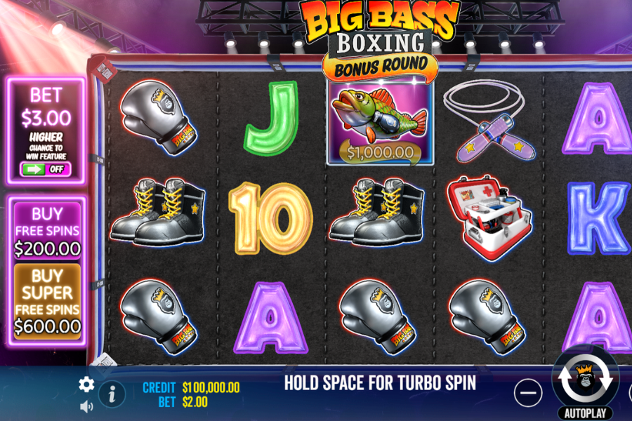 Big Bass Boxing Bonus Round plays out across 5 reels and 3 rows with 10 paylines. At its core, it’s built on a traditional slot structure but overlays it with a feature-packed progression.