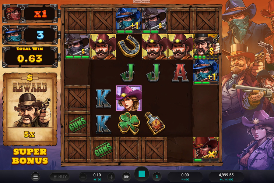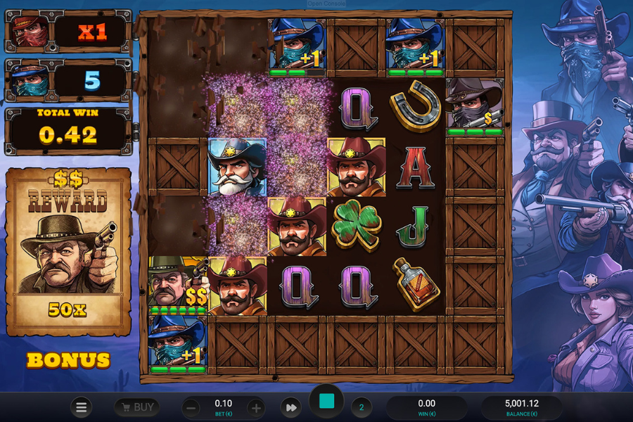 Bounty County runs on a huge 6×6 grid with a scatter pays system. This means winning symbols don’t necessarily need to be in a line like a traditional slot. As long as you’ve got 4+ of the same symbol anywhere on the grid, you’re good to go and you’ll walk away with something. It’s a system that gives the game a casual feel while still leaving room for some calculated gameplay by the more experienced players.