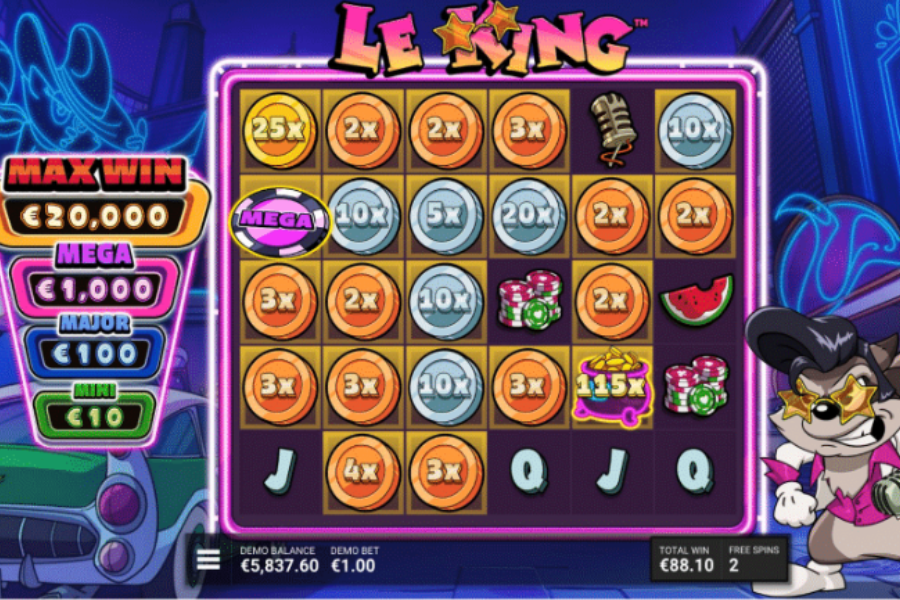 Le King is what happens when you take a standard cluster slot and flip it into a feature-rich heist show.