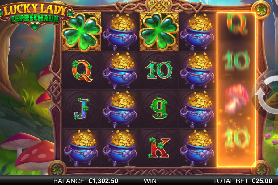 It’s everything you’ve come to expect from a leprechaun-themed slot — It’s bright, colorful, and loaded with familiar Irish symbols. You’ll find 4-leaf clovers, horseshoes, cauldrons of gold, and the Lucky Lady herself.