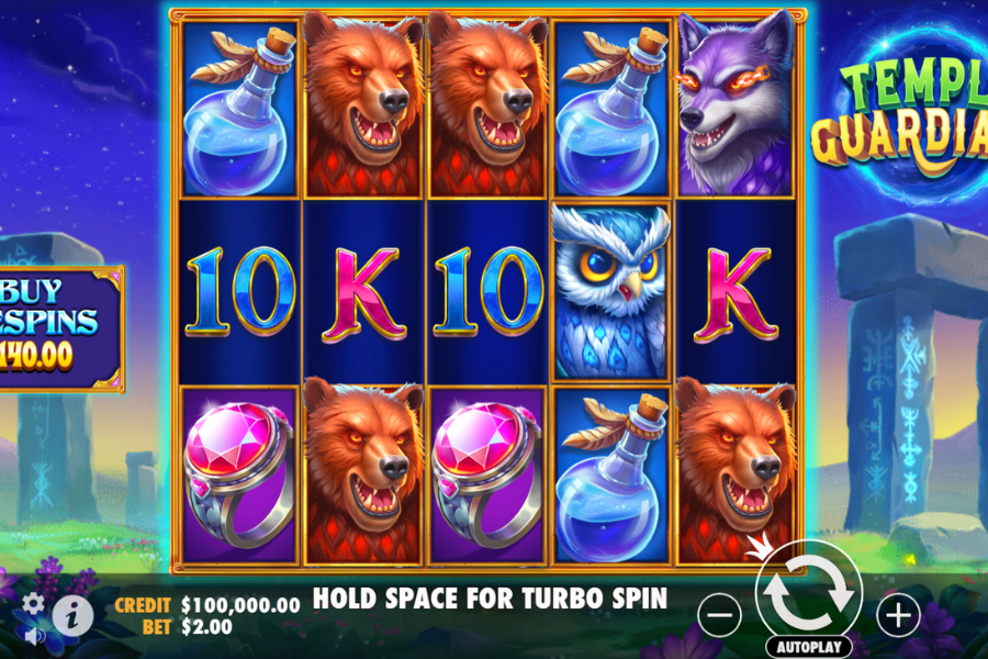 Temple Guardians runs on a standard 5×3 grid with 10 paylines. Yes, that sounds simple, but that’s just the surface. The game takes this familiar structure and loads it with vibrant character symbols like bears, wolves, owls, and a hooded guardian — everything you’d imagine you’d see in an enchanted forest. Keep in mind, however, that these aren’t just pretty designs — they also carry high payout potential.